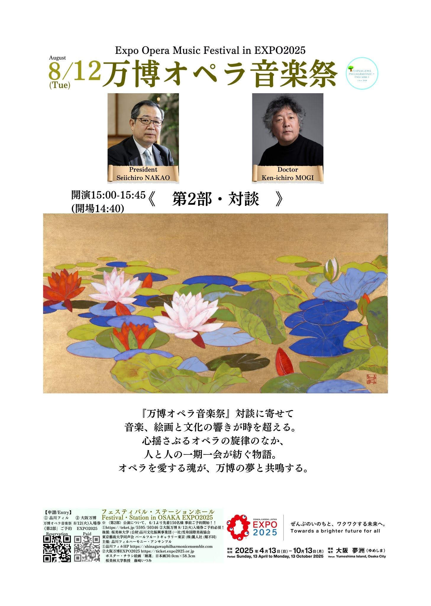 EXPO2025大阪・関西万博「万博オペラ音楽祭」品川フィルハーモニーアンサンブル/フェスティバルステーション にて8月12日開催の第2部の対談/茂木健一郎&中尾清一郎に『睡蓮』がポスターチラシ、ステージバックスクリーン映像に採用されました